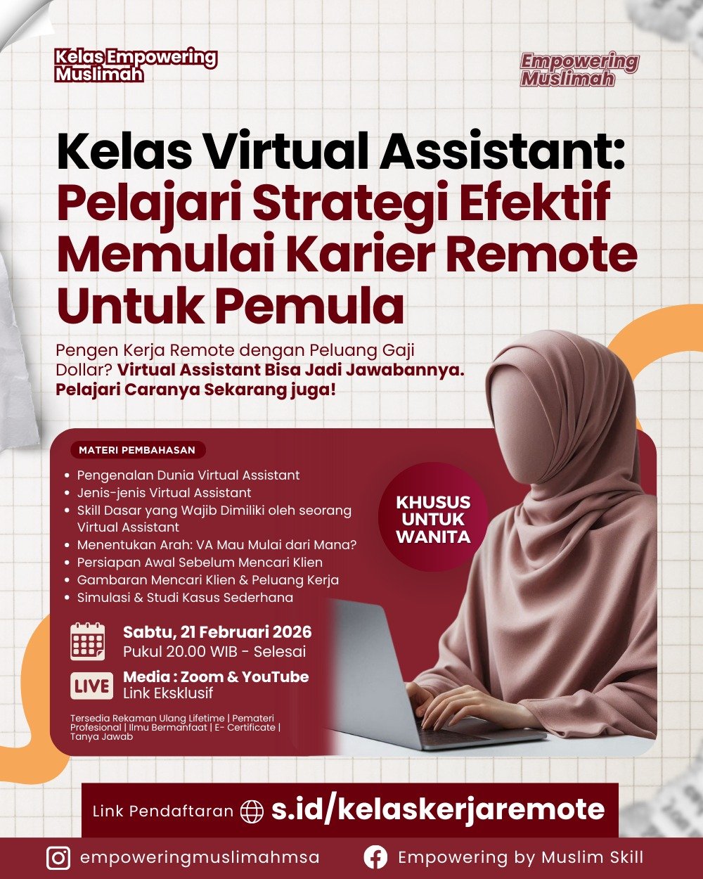 Kelas ini hadir sbuat kamu yang ingin memahami dunia Virtual Assistant secara utuh—dari dasar hingga gambaran peluang klien internasional—agar langkah awalmu lebih terarah dan tidak sekadar ikut tren.